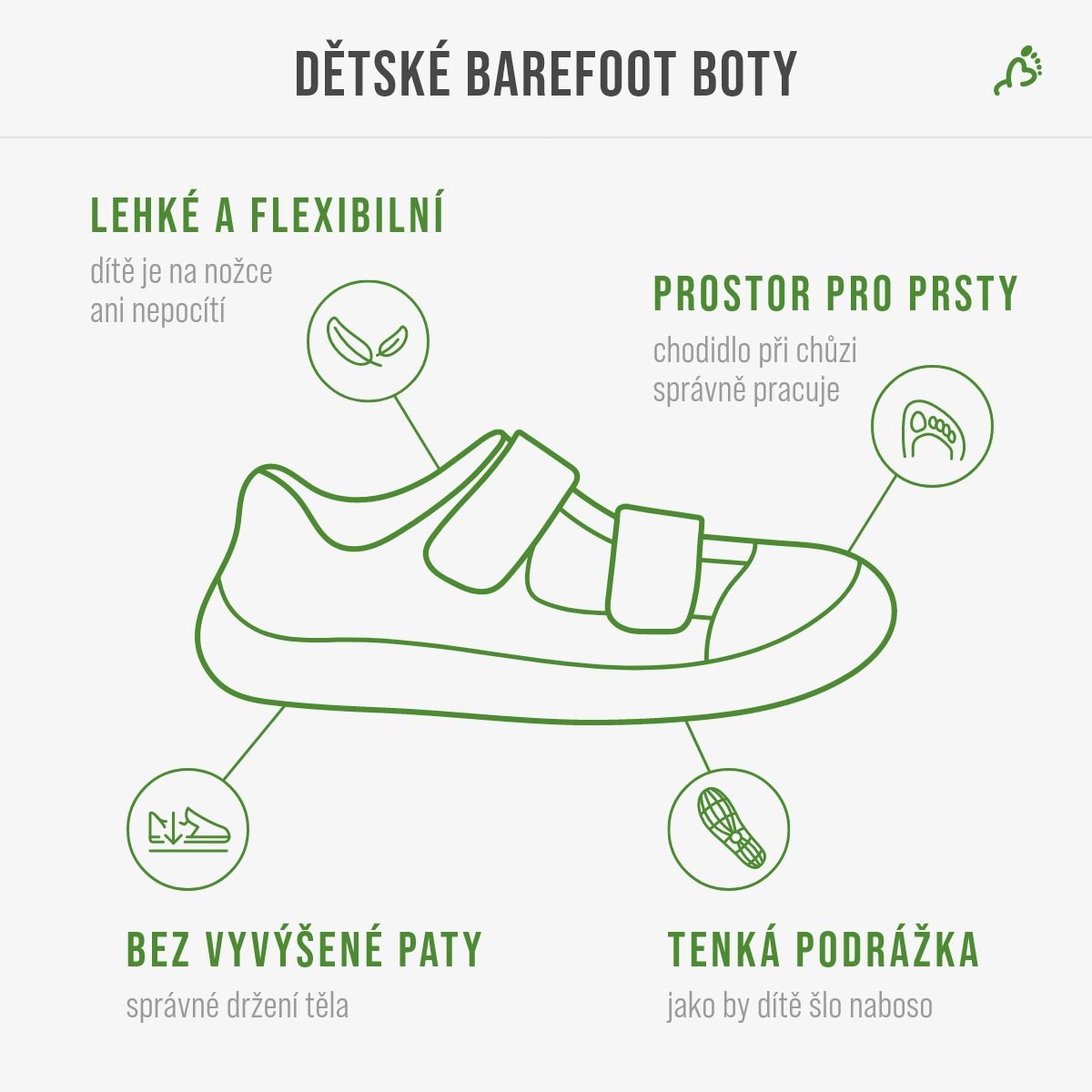 Barefoot boty simulují chůzi naboso. Správně zvolené a dobře padnoucí botičky umožňují zdravý vývoj dětské nohy. Zároveň chrání před špínou, nepřízní počasí nebo poraněním.