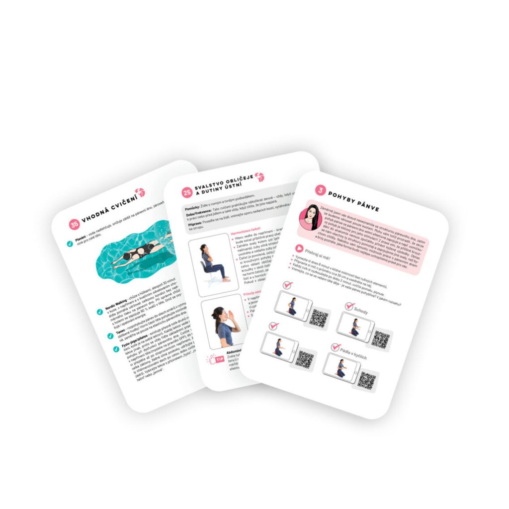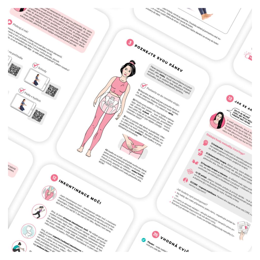 Unikátní Karty, které vám pomohou efektivně řešit časté dysfunkce svaloviny pánevního dna (a s tím se pojící přidružené potíže). 100 účinných cvičení pro domácí prostředí s komplexní edukací.